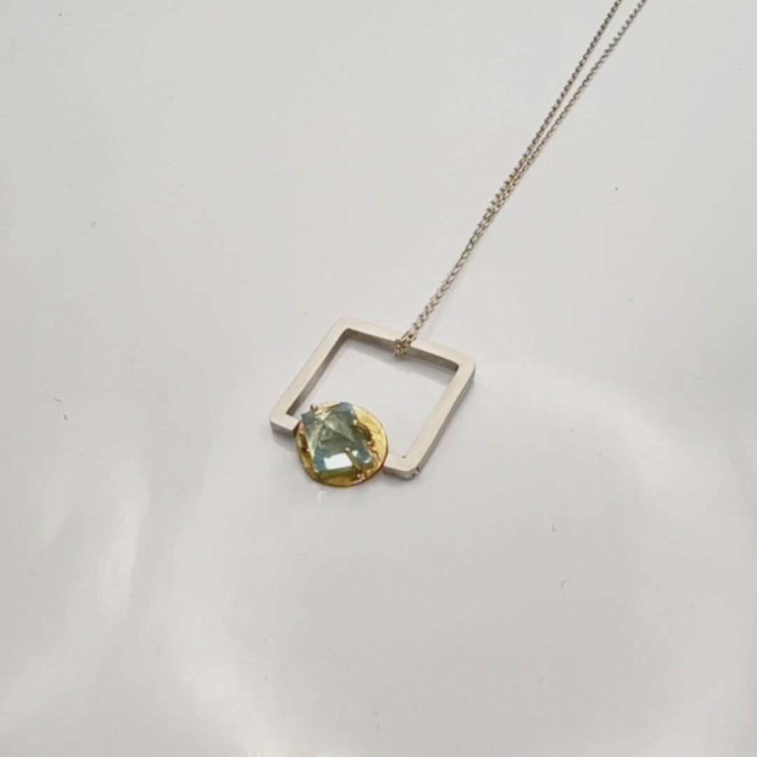This is a versatile piece. Very modern and elegant, it has a mix of metals, and a mix of uses, both gorgeous. With a faceted stunning aquamarine, this piece is a highlight for any outfit. The gold part can be turned around to be used as a pendant or a ring, you choose!
