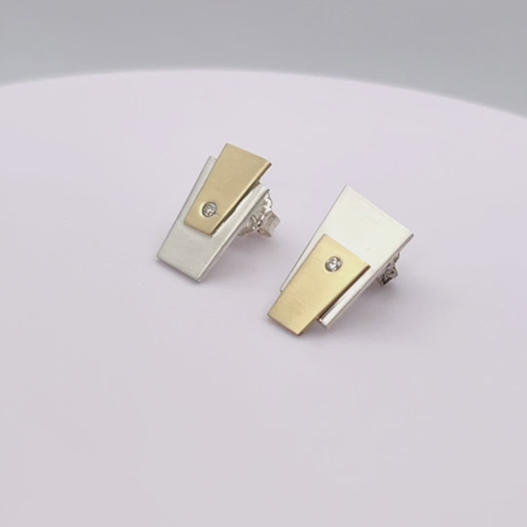 Discover elegance and artistry with the Two Tones geometric Earrings. Handmade to order in Sterling Silver, with your choice of 10K or 14K yellow solid gold. Each piece features a 2 mm natural round diamonds, reflecting your unique style and sophistication. These earrings are perfect for enhancing any outfit, they are created for you, ensuring you exclusivity and an elevated style every time.