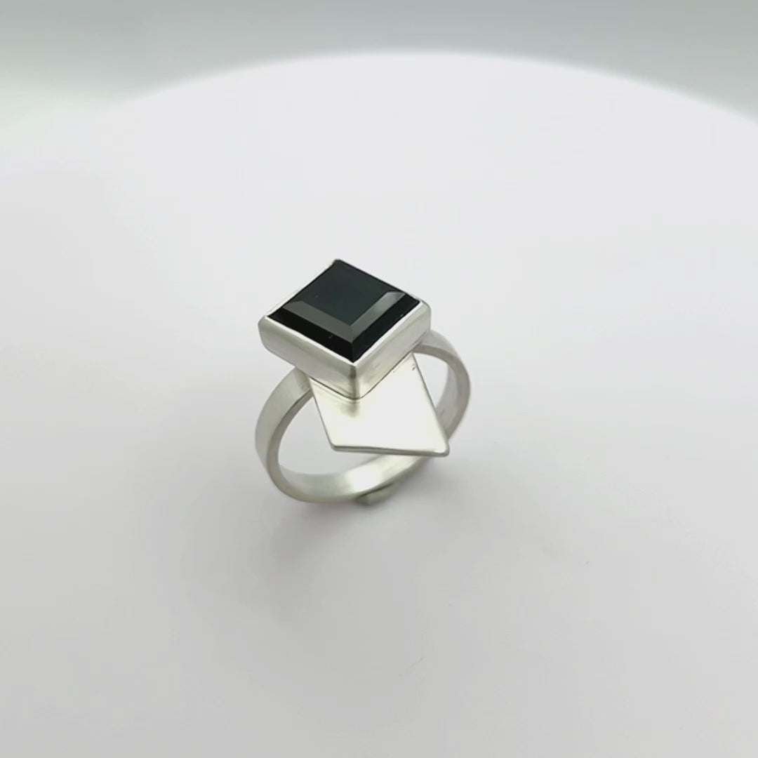 Made in Sterling Silver with a step-cut squared black spinel.
