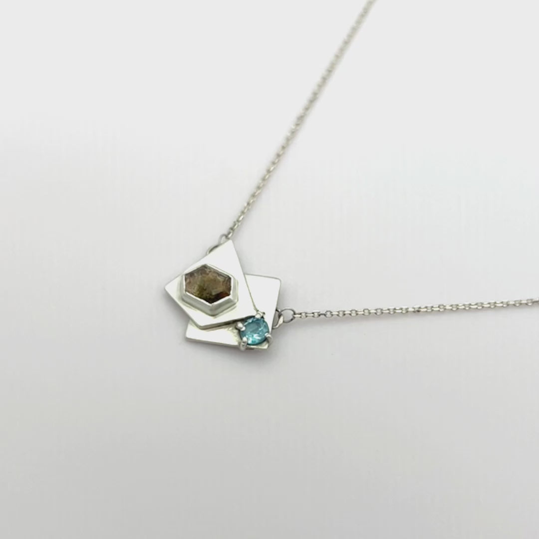 This one of a kind necklace is a sculptural jewelry piece. Designed to create a contrast between the straight lines of the silver and the hexagonal tourmaline, and the round curve, of the bright blue topaz gemstone this necklace is a piece of art. Perfect for you who appreciates contemporary art and loves the exclusivity of one-of-a-kind pieces.